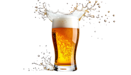 Pint glass overflowing with bubbly, golden liquid, creating splash against black background