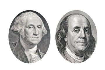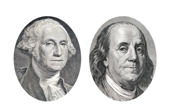 Portraits of George Washington and Benjamin Franklin from dollar bills isolated. America's money
