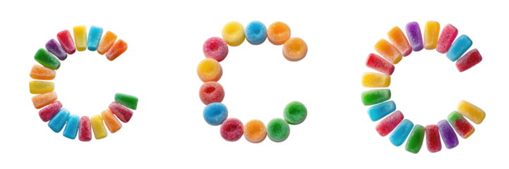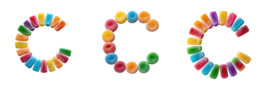 Colorful Sugar Candy Letters Forming the Letter C Isolated on transparent Background Arranged in Three Distinct Styles with Bright Colors and Varied Shapes