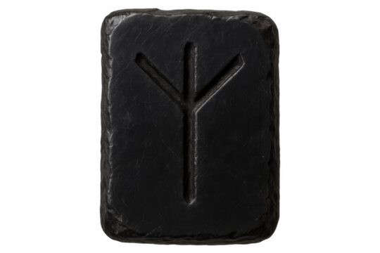 Glowing green algiz rune carved on stone surface, symbolizing spiritual protection and divine connection against transparent backdrop