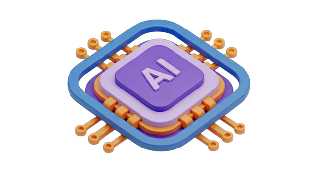 Stylized 3D Rendering of an AI Microchip with Purple and Blue Accents on a Transparent Background Symbolizing Artificial Intelligence and Technology