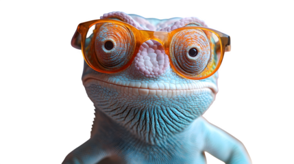 Colorful chameleon lizard with sunglasses, exotic pet concept, isolated on white background
