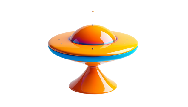 Futuristic flying saucer spaceship with glowing lights isolated on transparent background, a science fiction concept for space travel and exploration