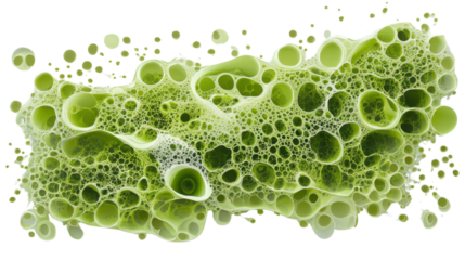Green foam with bubbles creating an abstract pattern on transparent background