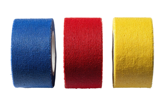 Three rolls of textured tape in vibrant colors.  The tapes are cylindrical,  with a rough, granular surface.  Blue, red, and yellow colors are visible, displayed in horizontal alignment