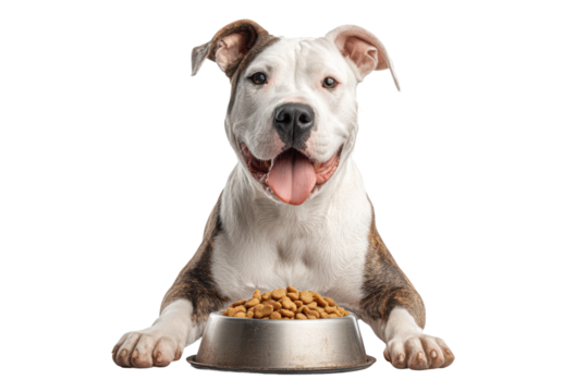 Fluffy puppy with bowl of dog food isolated on transparent background