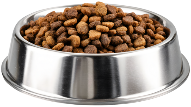 Close-up view of a filled stainless steel pet bowl with dry dog food on a background showcasing pet nutrition and healthy pet food choices.
