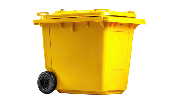 Yellow trash receptacle on wheels