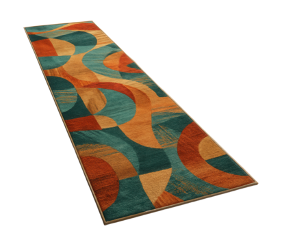 A colorful runner kitchen rug with abstract designs, made of durable olefin, perfect for a long, narrow galley kitchen in an apartment.