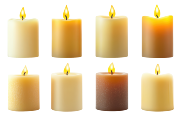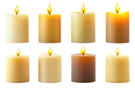 Collection of  burning candles of various sizes and textures isolated on transparent background. Set of pillar candles with flames illuminated isolated on white background.