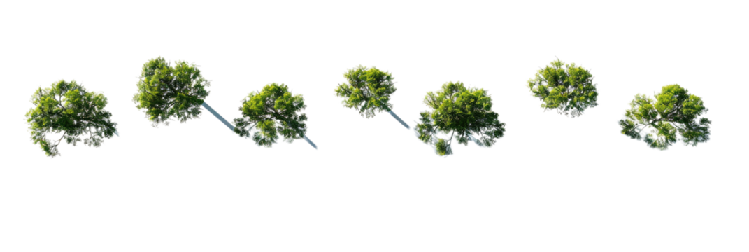 PNG. A photorealistic, high-resolution top-down view of trees with their shadows on a white background. The scene is set in the middle and has five distinct trees, each at a different angle.