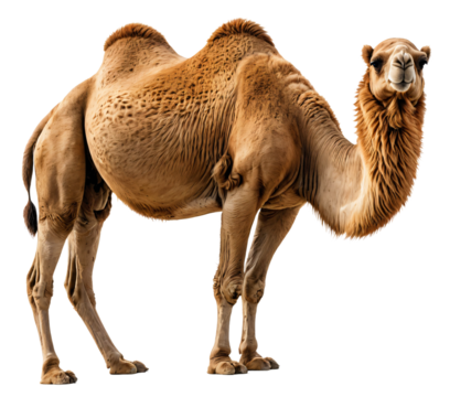 A light brown camel with a darker brown back and lighter brown legs stands on all fours, facing the camera with a relaxed demeanor, against a stark white background