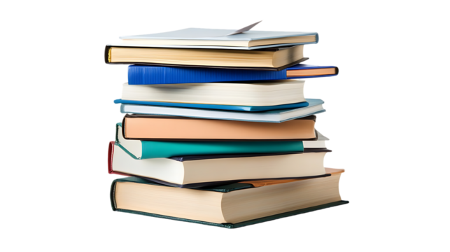 A set of books. Stacks of books for learning. Many books are stacked on top of each other. Isolated on a transparent background.