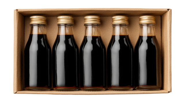 Five small, dark-colored glass bottles, tightly arranged in a light kraft paper box. Gold-colored caps seal each bottle