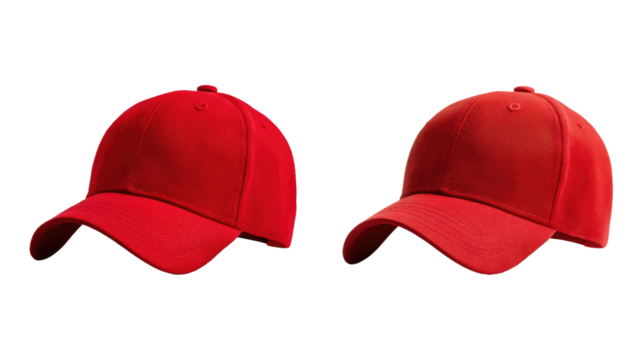 Red Caps: Two striking red caps, each elegantly angled to showcase their design. A simple study in fashion.