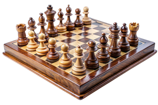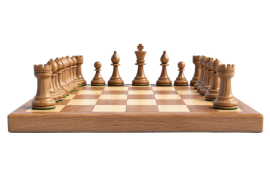 A wooden chess board with all the pieces set up, isolated on transparent background