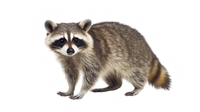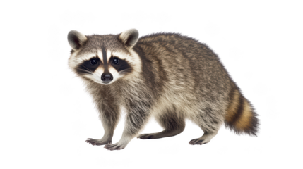 Raccoon standing on all fours with fluffy tail and distinctive facial markings, showcasing its curious expression and detailed fur texture.