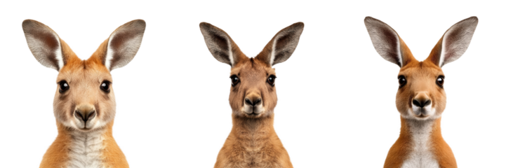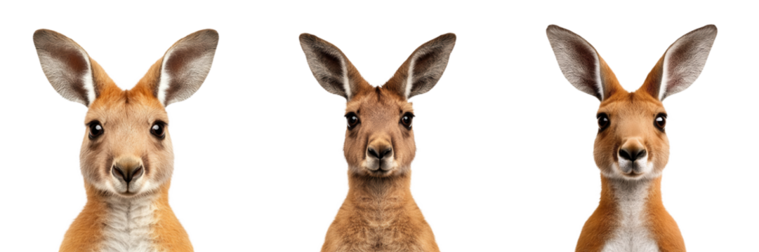 Three kangaroos are displayed, each with distinct features, showcasing their curiosity and unique expressions.