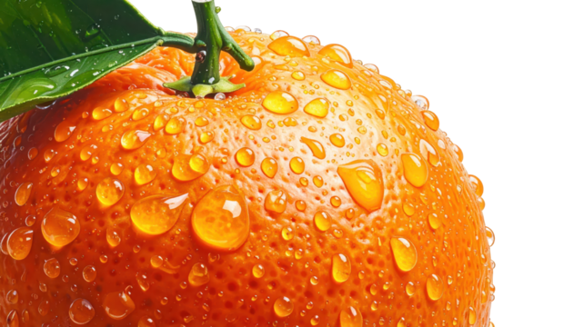 image of a juicy orange fruit covered with glistening water droplets, showcasing vibrant orange hues and a natural green leaf, all set against a stark black background.