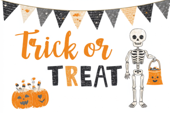 A festive Halloween illustration featuring 'Trick or TREAT' text, a skeleton with a candy bucket, and carved pumpkins with treats, all under decorative bunting.