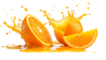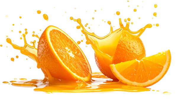 A vibrant image showcasing a halved orange with juice pouring over it, an intact orange and a slice, all against a dark background