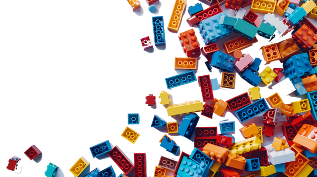 A pile of colorful blocks scattered all over the place. The bricks of different shapes and sizes to show diversity