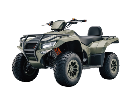 Rugged all terrain vehicle ATV with sleek design, featuring large tires and sturdy frame, ideal for off road adventures. ATV is equipped with comfortable seat and handlebars for easy