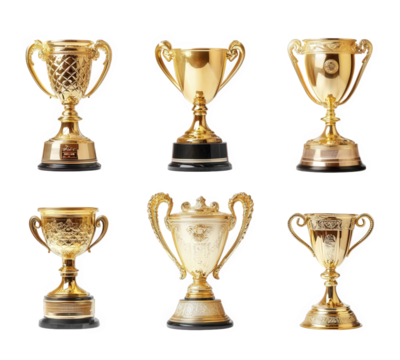 collection of six ornate golden trophies displayed in a grid format each trophy varies in design and size. showcasing intricate details and a polished finish. symbolizing achievement and success in va