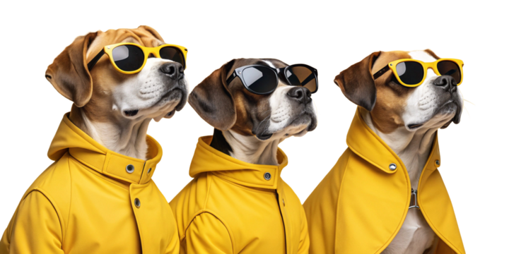 Cool Canine Trio in Sunglasses: Three dogs stand side-by-side, each donning stylish sunglasses and yellow raincoats, exuding a sense of cool camaraderie and prepared for any weather