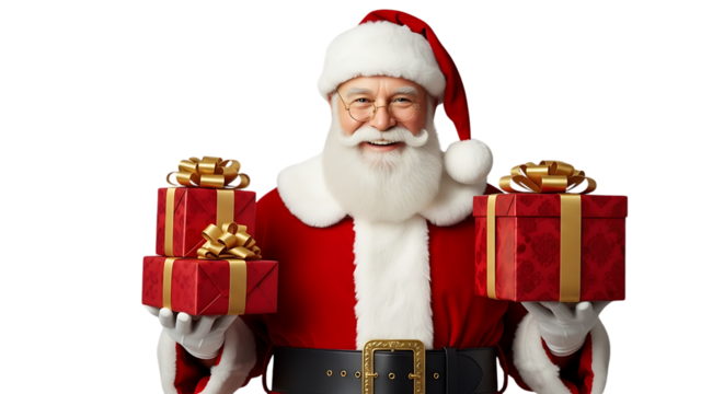 Joyful Santa Claus shares festive red gift boxes with golden bows, spreading holiday cheer and holiday spirit to all