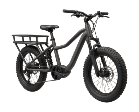Versatile cargo bike featuring wide tires and shock-absorbing suspension for all terrains.