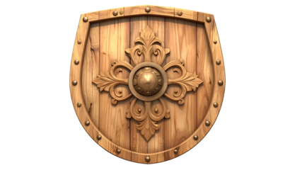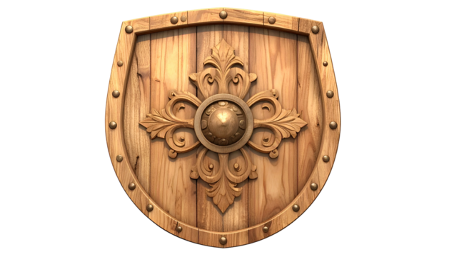 Wooden shield with ornate flourishes on a black background, symmetrical and detailed