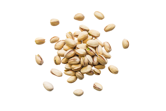 Roasted organic pistachio nuts with shell isolated on a transparent background without shadow, top view, png