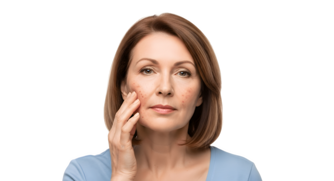 Concerned middleaged woman touching red irritated skin on her cheek.