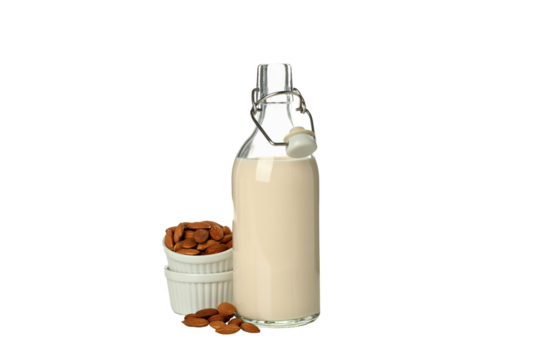 PNG, Bottle of milk and almonds in bowls, isolated on white background