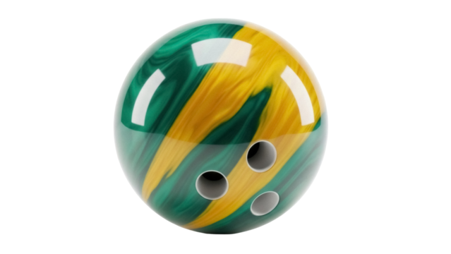 Isolated bowling ball with green and gold swirls, three finger holes, ready for a strike