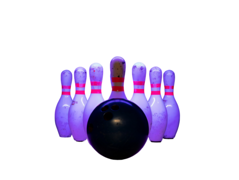 Black silhouette of a single ten pin bowling ball with white pins in a bowling alley lane image