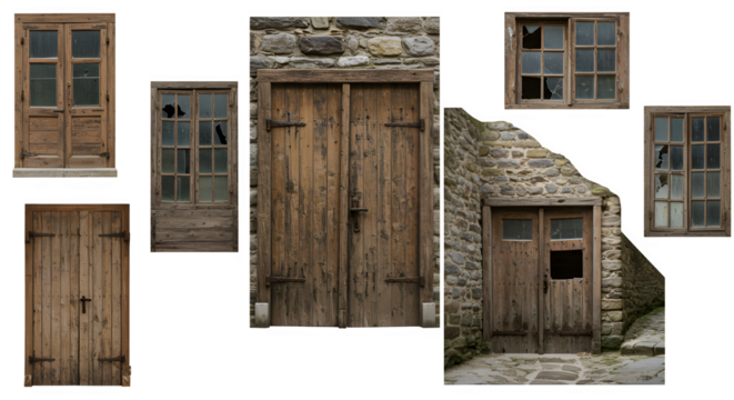 Old rustic doors, windows, or alleyways isolated on PNG background.