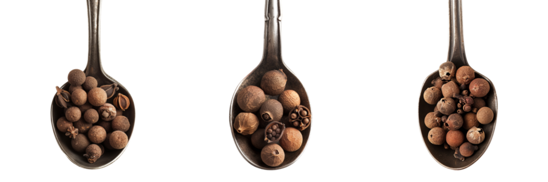 PNG. Dry allspice grains are randomly scattered across the surface, top view.