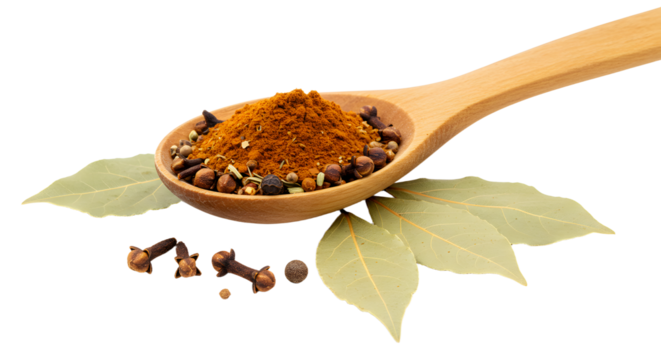 Ground allspice with whole berries and bay leaves on a wooden spoon isolated on white background, perfect for culinary and seasoning use