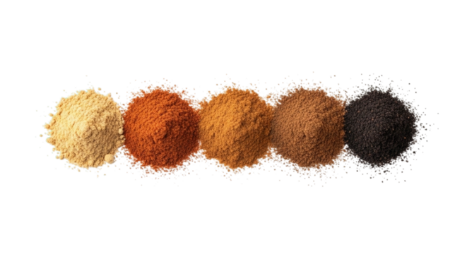 Isolated pumpkin spice ingredients in five separate piles, including ground ginger, cinnamon, nutmeg, allspice, and clove, on a white and transparent background