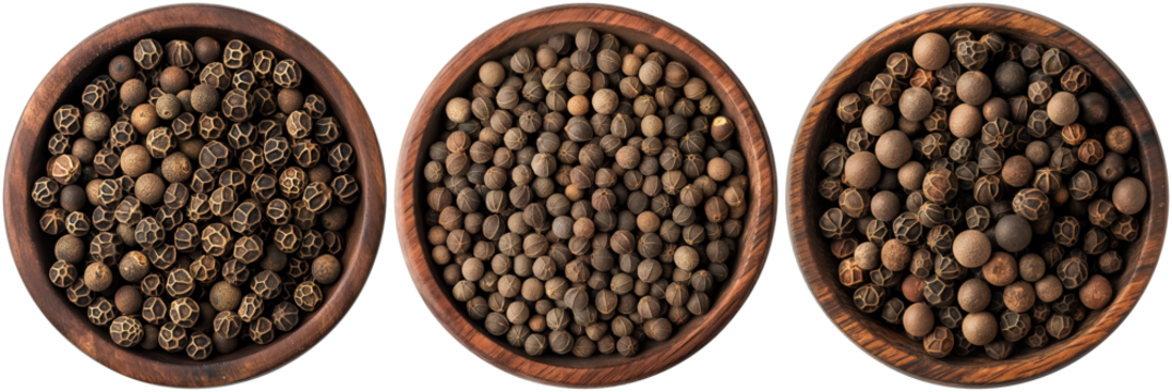 set of peppercorn allspice pepper in brown wooden bowl, cut out