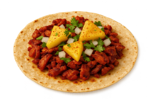 Delicious taco al pastor with pineapple on transparent background image.