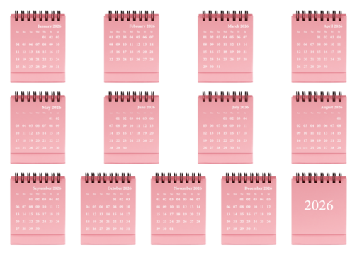 Red desktop calendar template featuring clean grid layout, spiral-bound planner mockup with monthly pages for 2026 organization