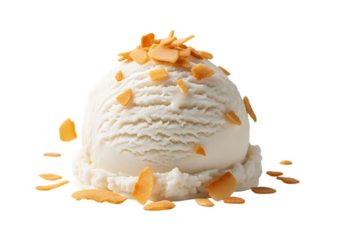Vanilla ice cream scoop with almond flakes, isolated on transparent background