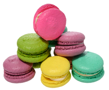 An assortment of colorful macarons, isolated background
