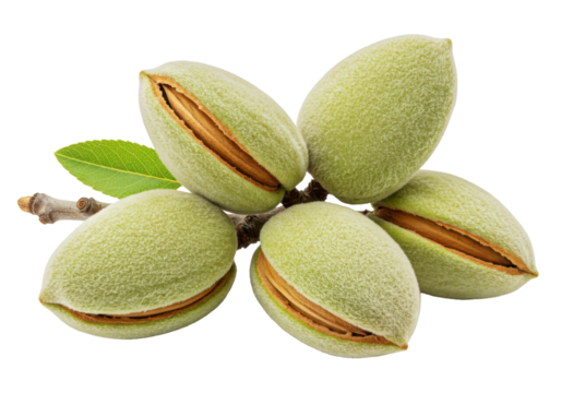 Isolated young green almonds on branch ready to be harvested; healthy eating concept