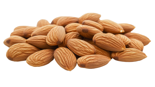 Almonds splashing into beige almond milk with dynamic motion and detailed droplets, isolated on a transparent background
