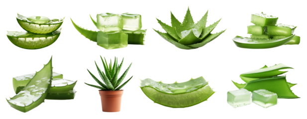 Green Aloe vera vegetable plant, many angles and view side top front cluster pile group isolated on transparent background cutout, PNG file. Mockup template for artwork graphic design