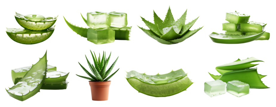 Fresh aloe vera leaves with water droplets on a white isolated background transparent